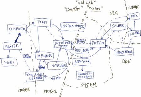 The compiler includes a parser which constructs a types hierarchy which is stored in a library. When a model (or instance) of a specific type is instantiated, it creates an Instance tree, the top node of which is a 'simulation' instance, and underneath which is a simulation root corresponding in structure to the type that was instantiated.