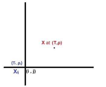 X = X_{i,j} + (T-T_i) \frac{\partial X}{\partial T}\bigg|_{i,j} + (\rho-\rho_j) \frac{\partial X}{\partial \rho}\bigg|_{i,j} </math>