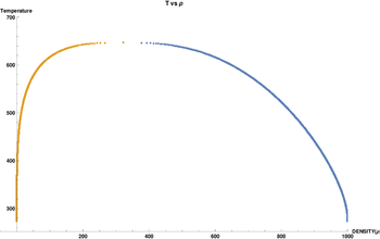 Saturation dome derived from helmholtz_sat().When the input temperature is between <math>T_t</math> and <math>T_c</math> we see the mixed states with both <math>\rho_f</math> and <math>\rho_g</math> computed by the function until they meet at <math>T_c</math>. The yellow points are for the fluid density and the blue points are for gaseous density of the mixed phase.